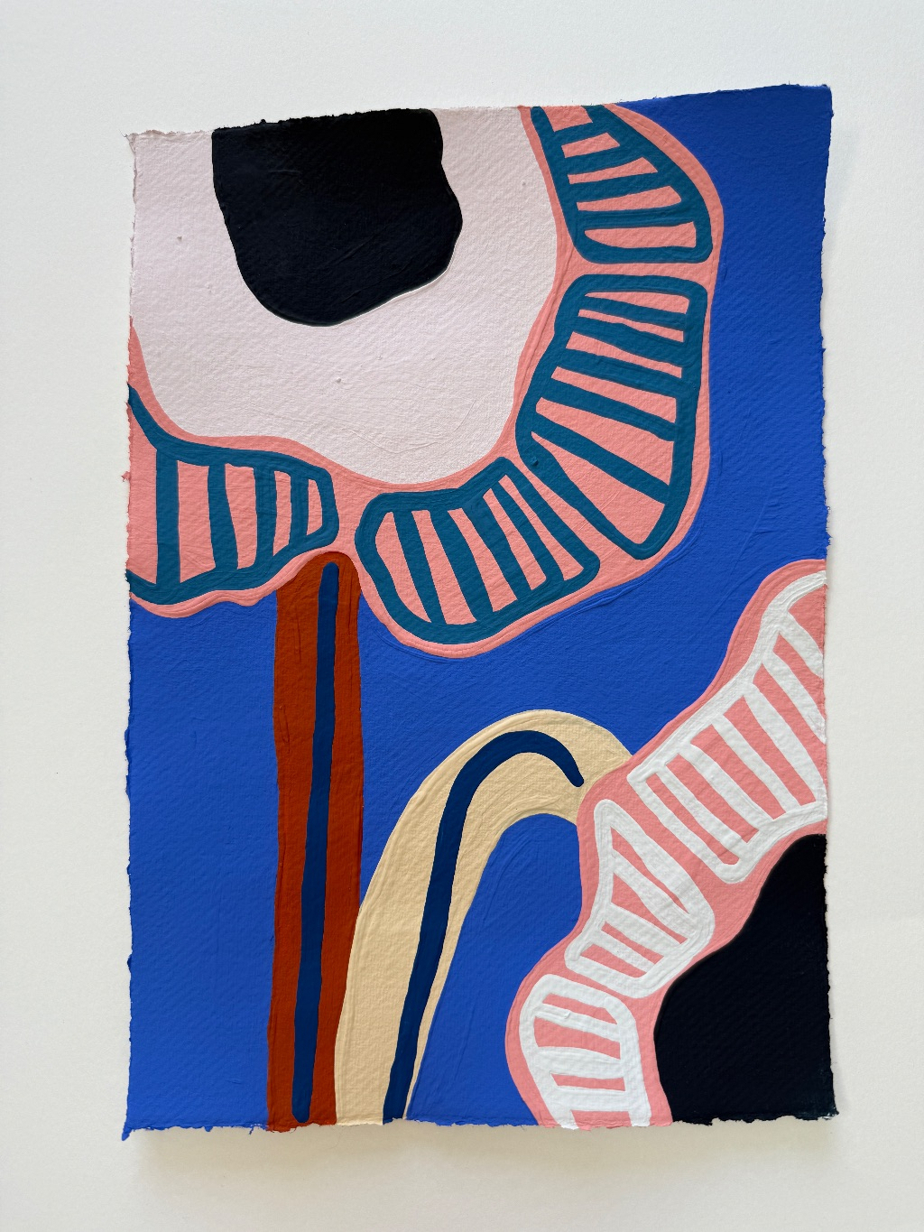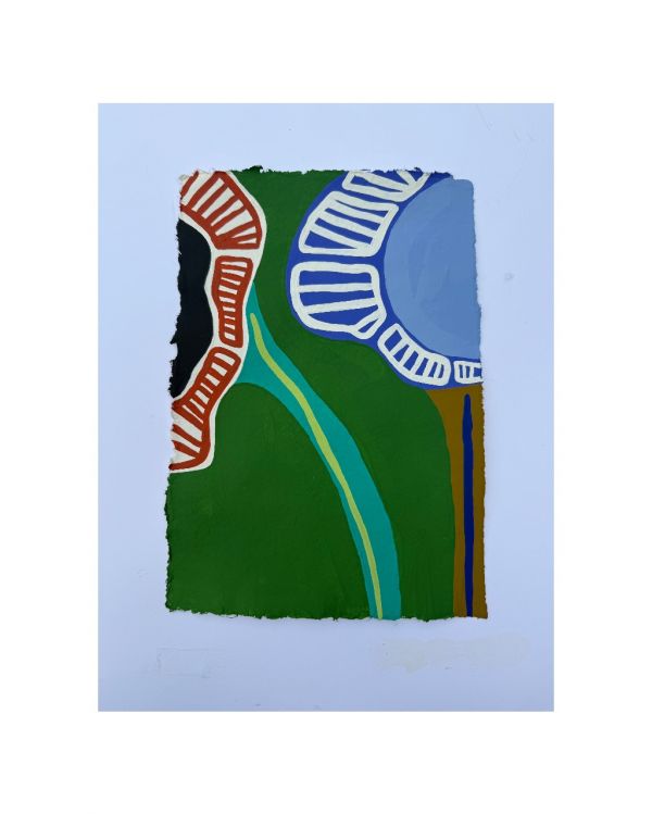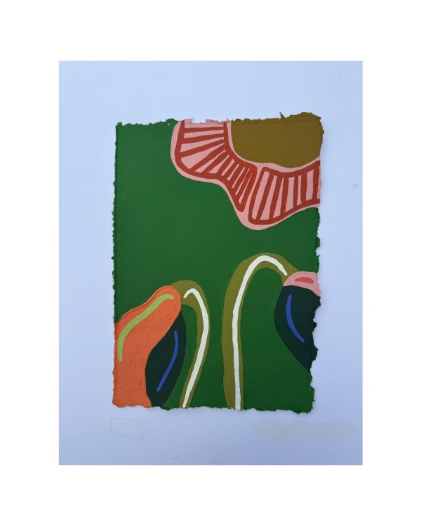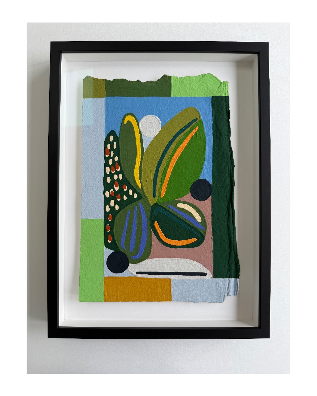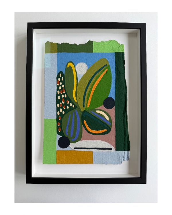 During lockdown, my art journey began, and with emulsion easily accessible, it sparked my affinity for its domesticity and interior-ready palettes. I enjoy the large pre-mixed palette and the speed at which it dries. I paint on handmade rag cotton papers, which offer a wonderfully textured, woollen surface and rough edges. The journey of the handmade paper from India gives my paintings extra character and strength.