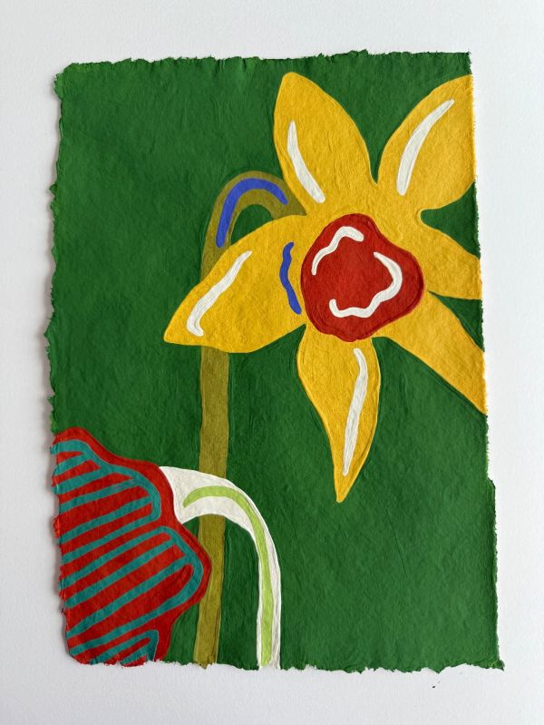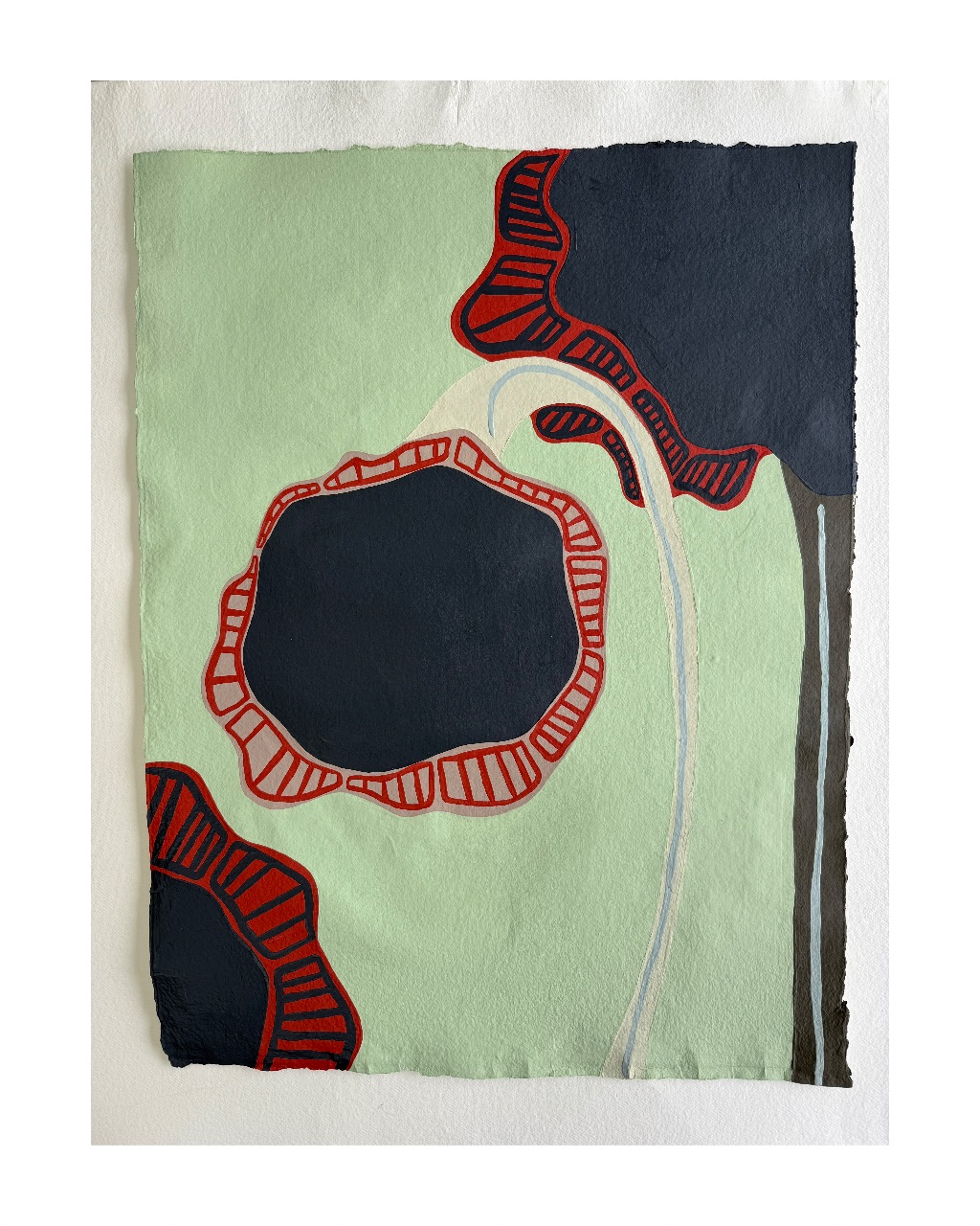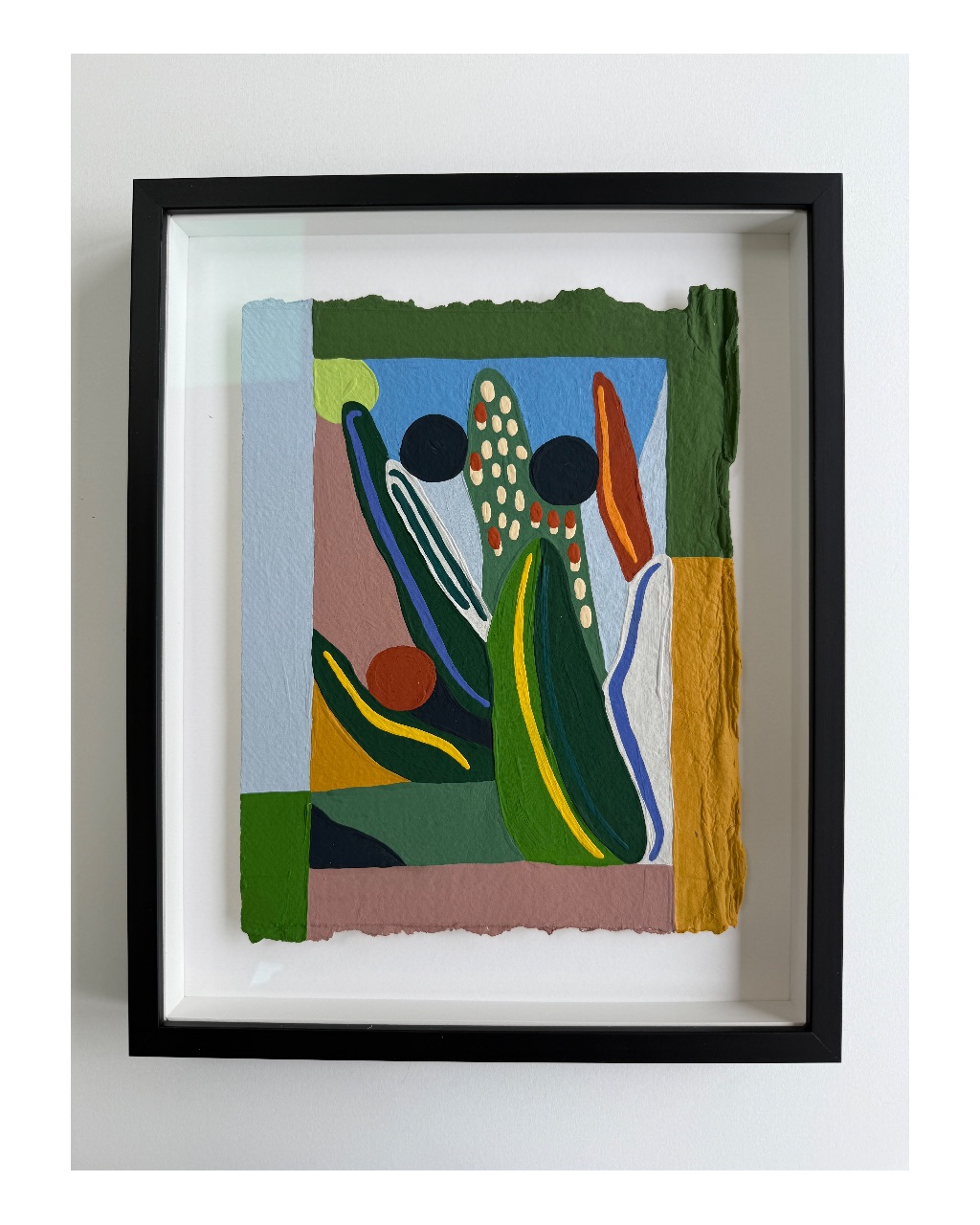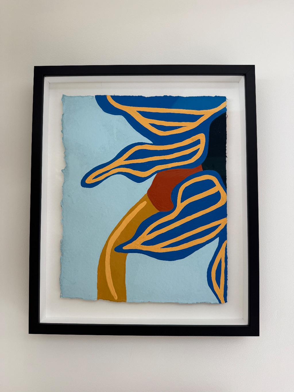 During lockdown, my art journey began, and with emulsion easily accessible, it sparked my affinity for its domesticity and interior-ready palettes. I enjoy the large pre-mixed palette and the speed at which it dries. I paint on handmade rag cotton papers, which offer a wonderfully textured, woollen surface and rough edges. The journey of the handmade paper from India gives my paintings extra character and strength.