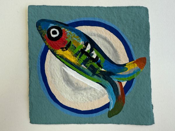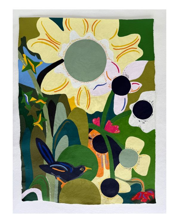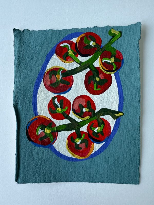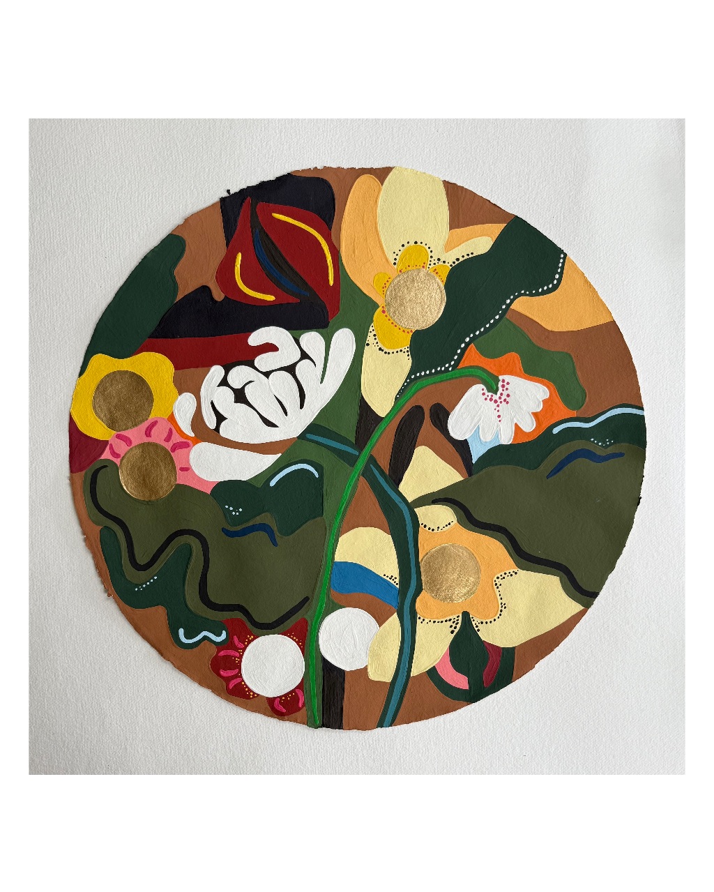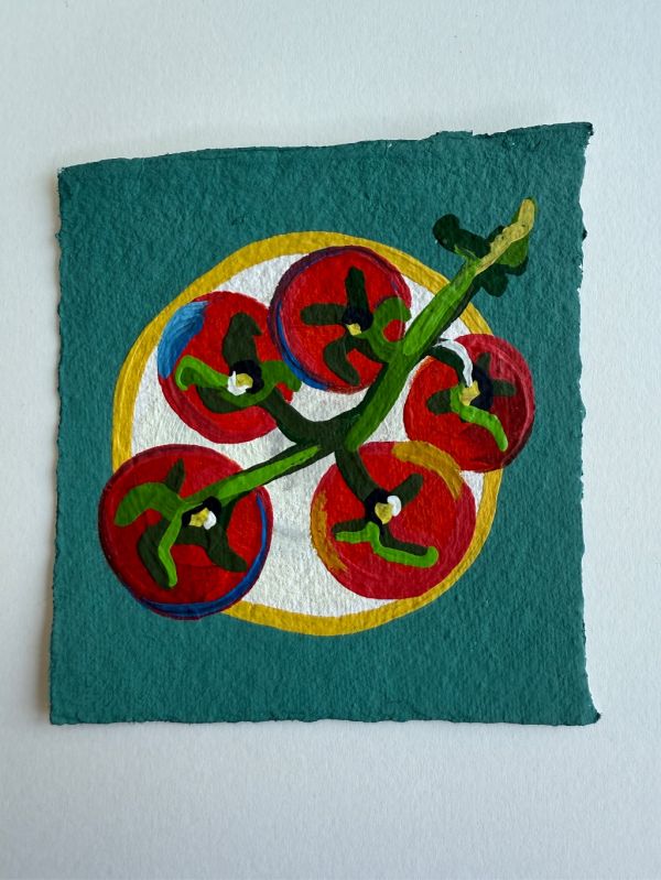 My paintings explore different themes, all deeply tied to nostalgia from my life and identity. The vibrant and colourful works evoke personal memories and experiences, from florals and birds to food.