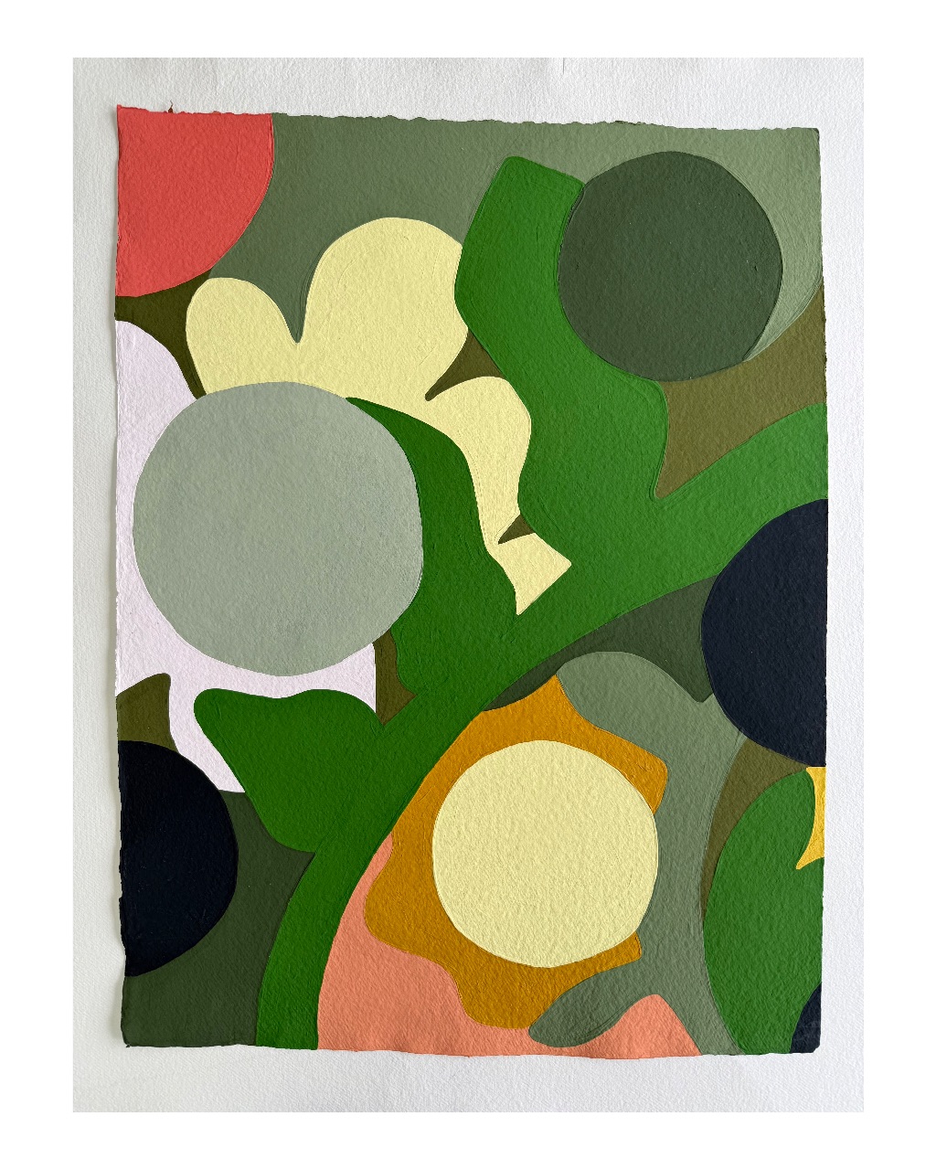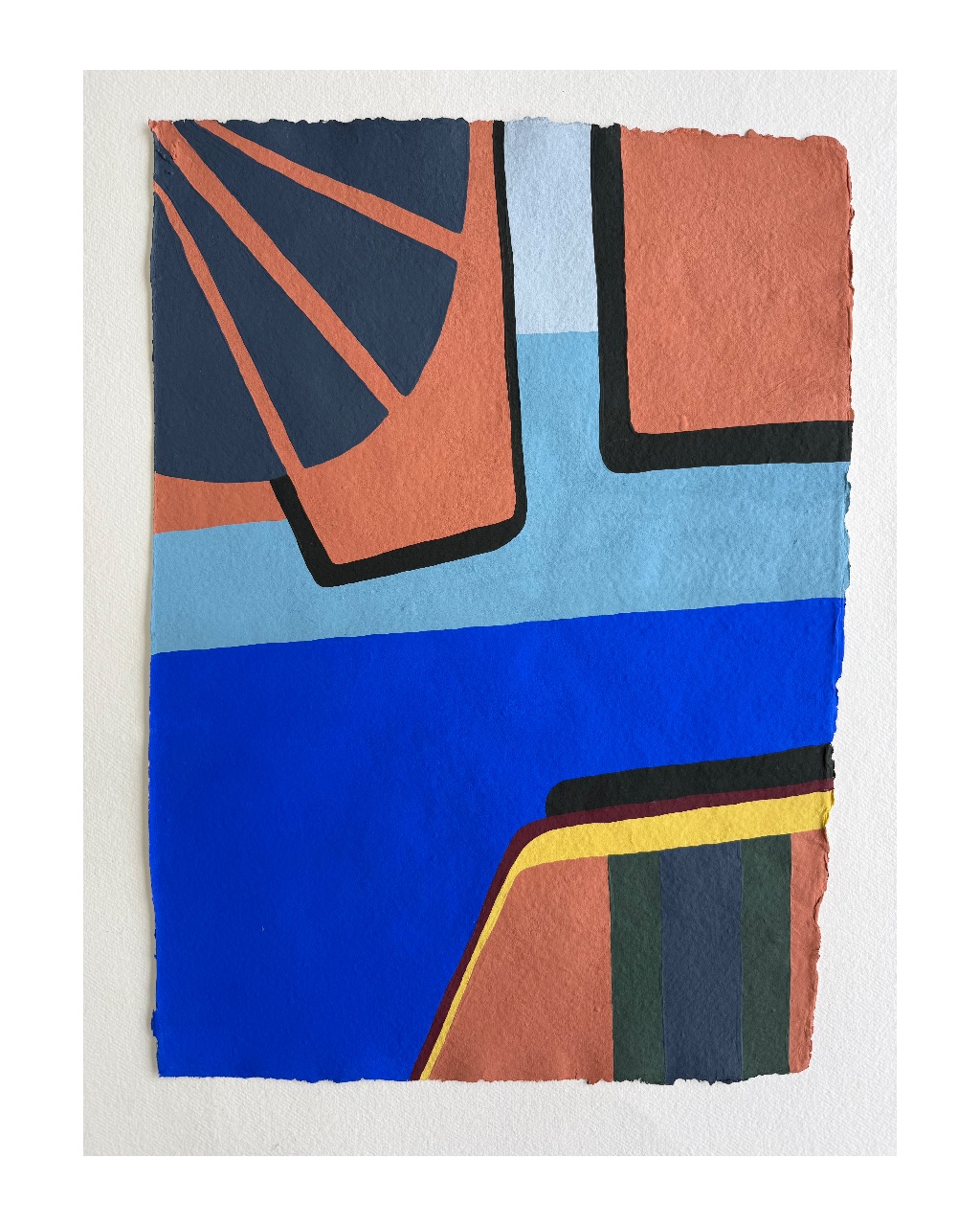 Painting is my meditative escape from the chaos of the world and my own moods. It provides me with a sense of control, reflected in my compositions and neat edges between the colours and shapes but with the contrast of the textured cotton paper and its ragged edges.