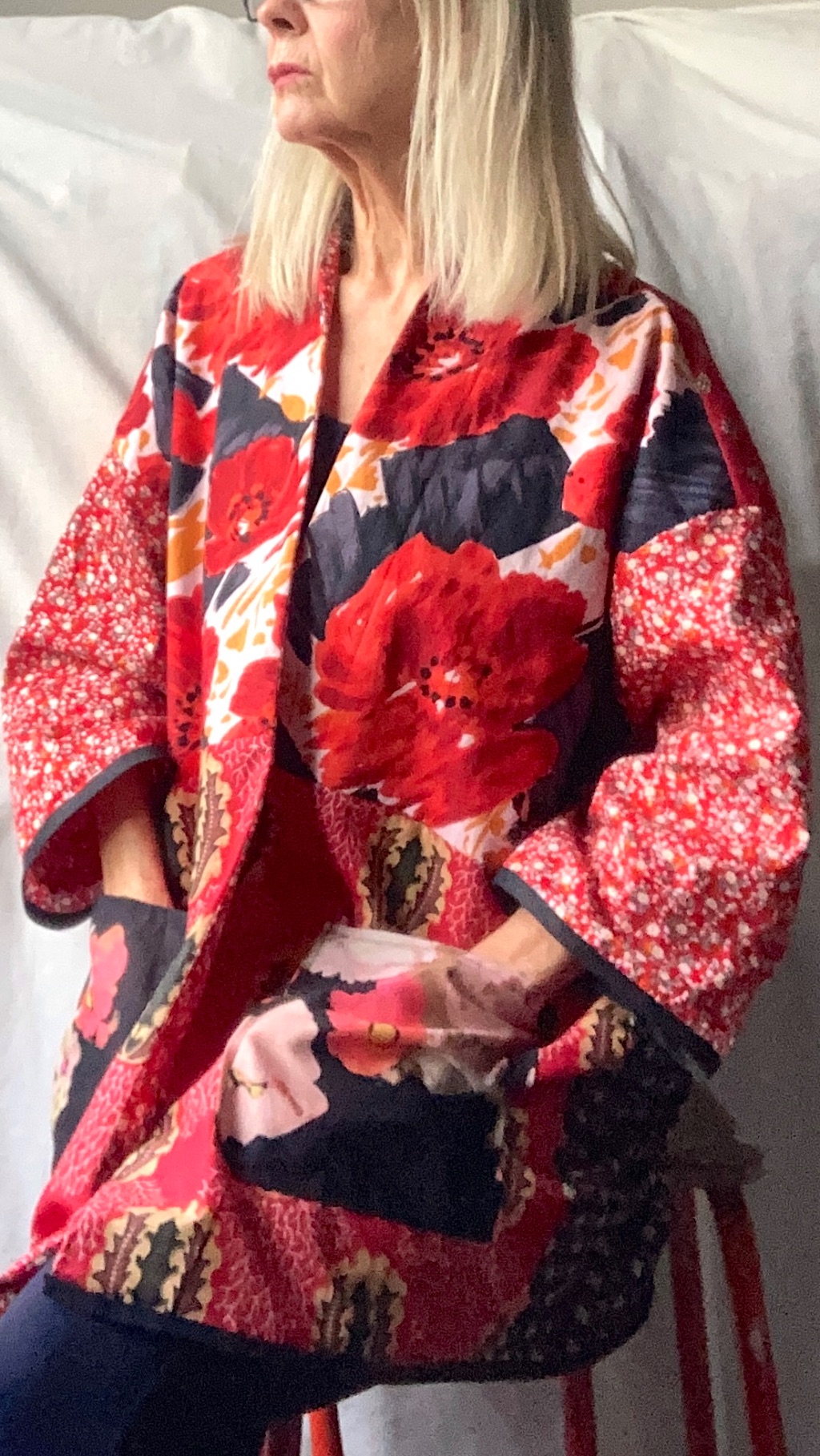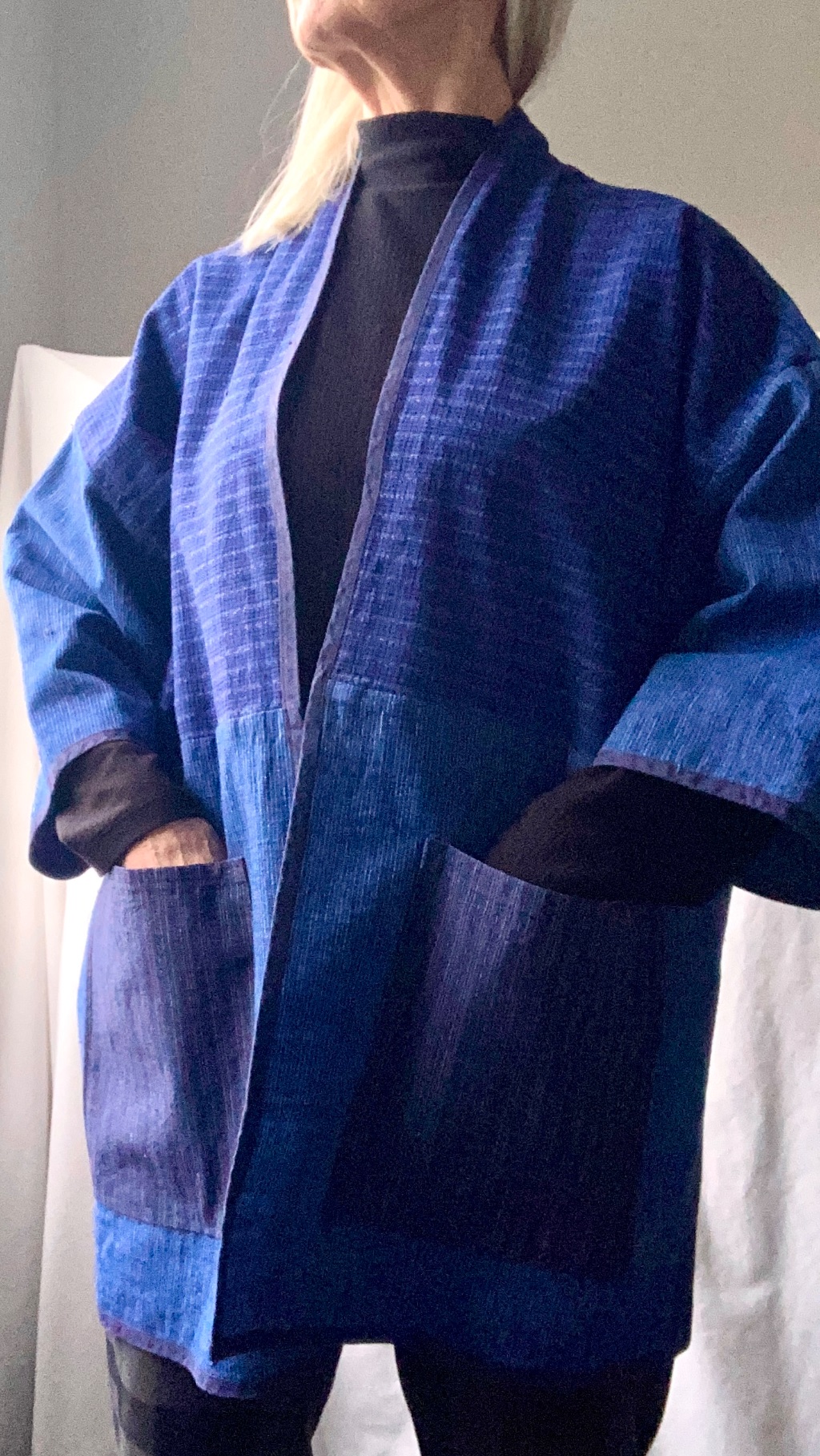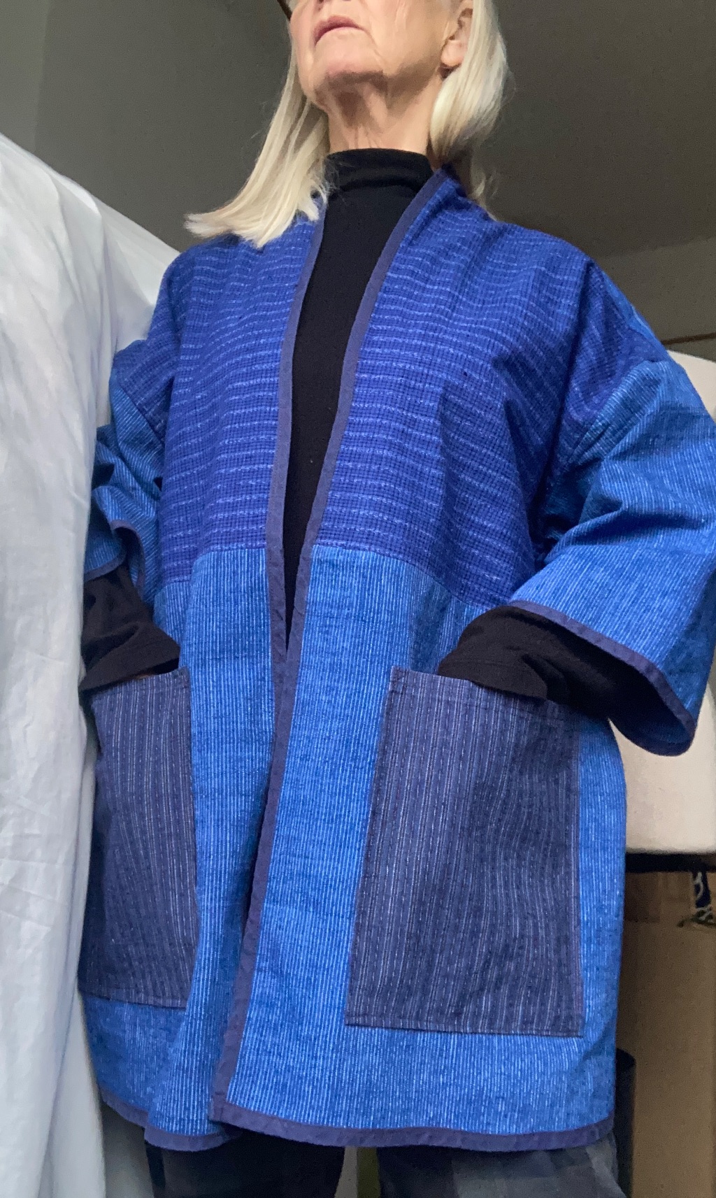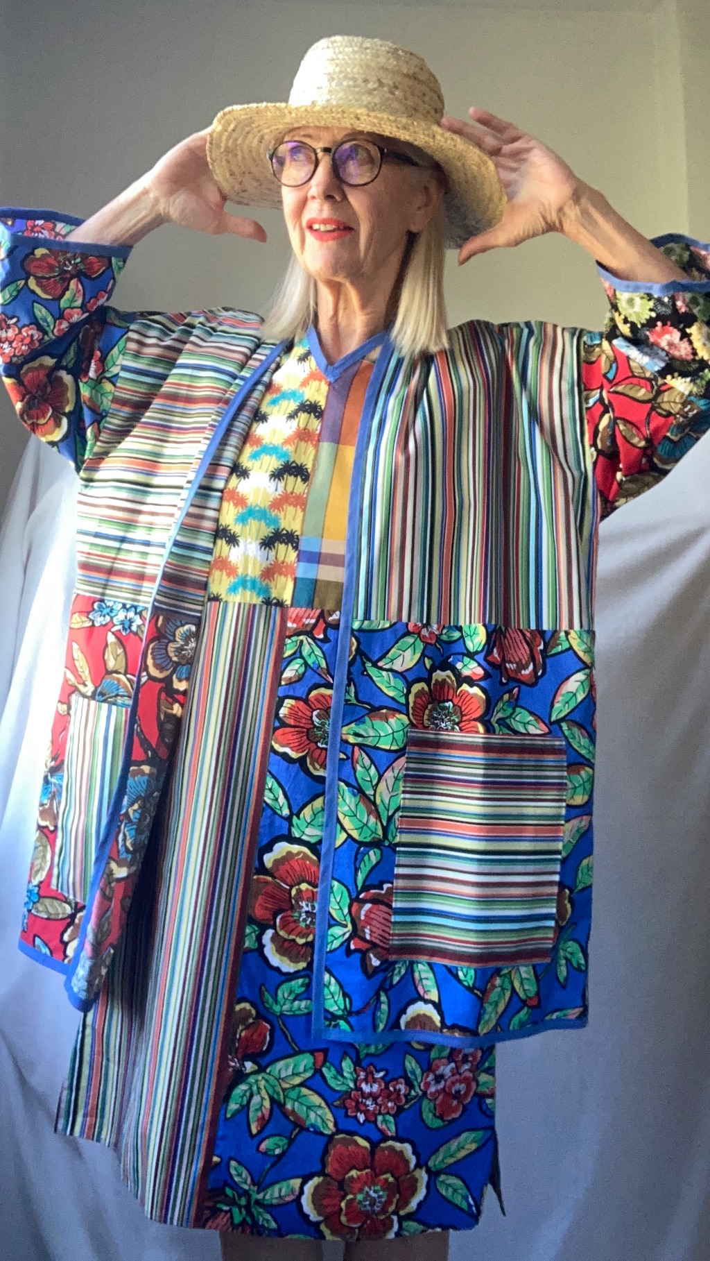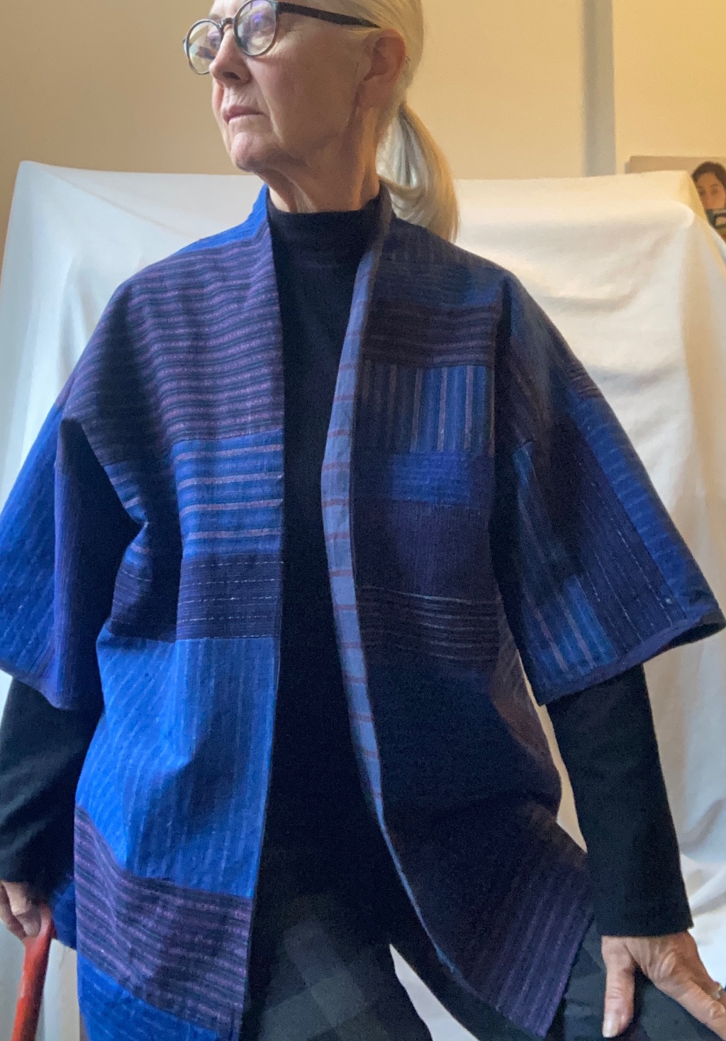 I create one-off kimonos, shirts,and accessories using fabric collected over 40+ years while travelling the world as a textile designer and lecturer. Each garment has its own story. They are made to wear, treasure, and keep.