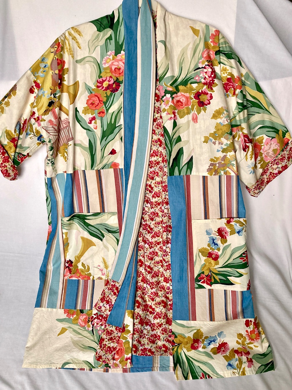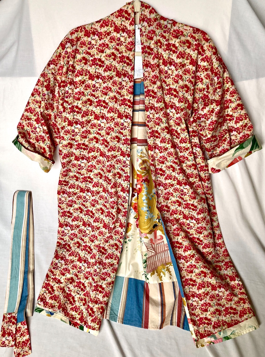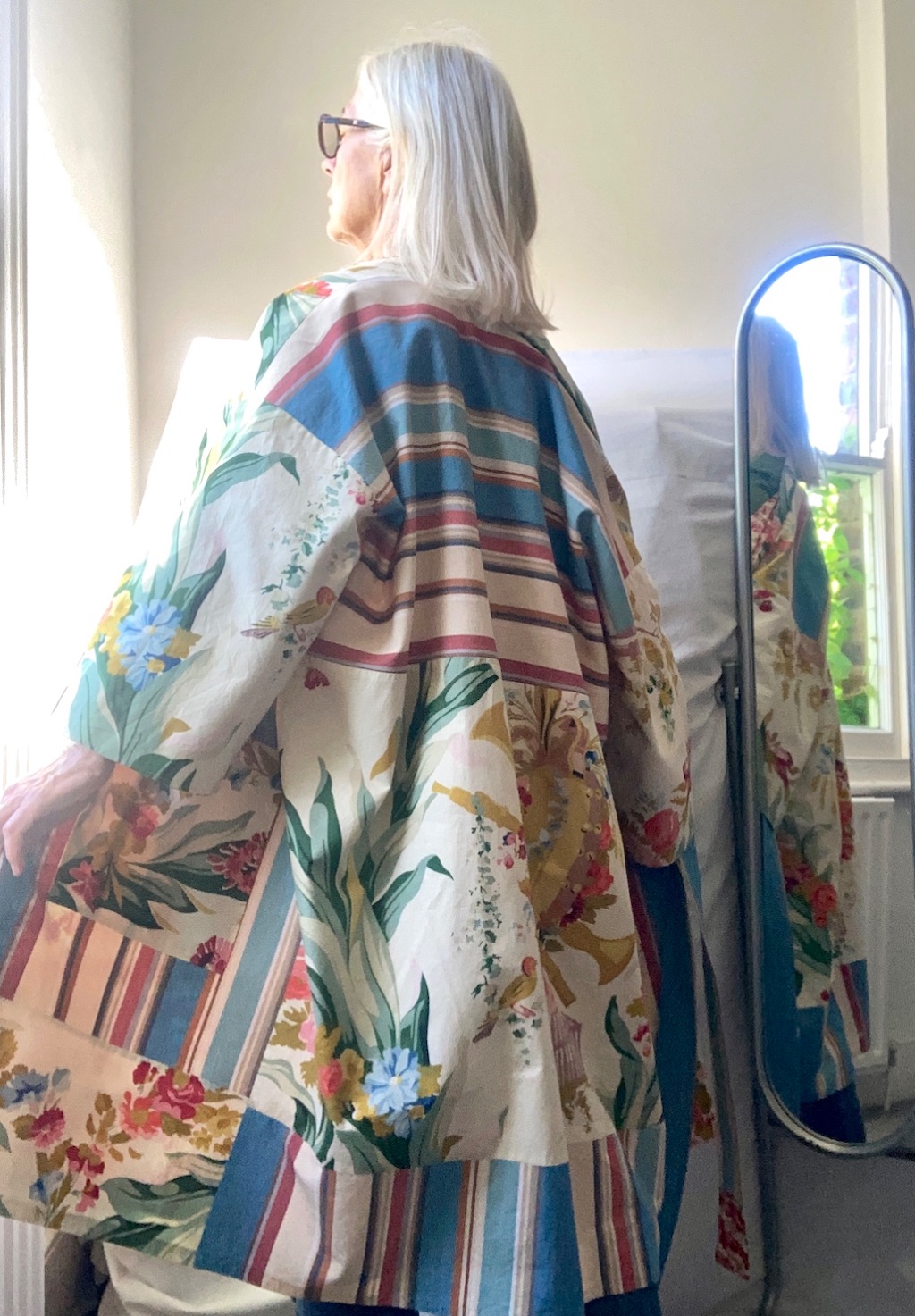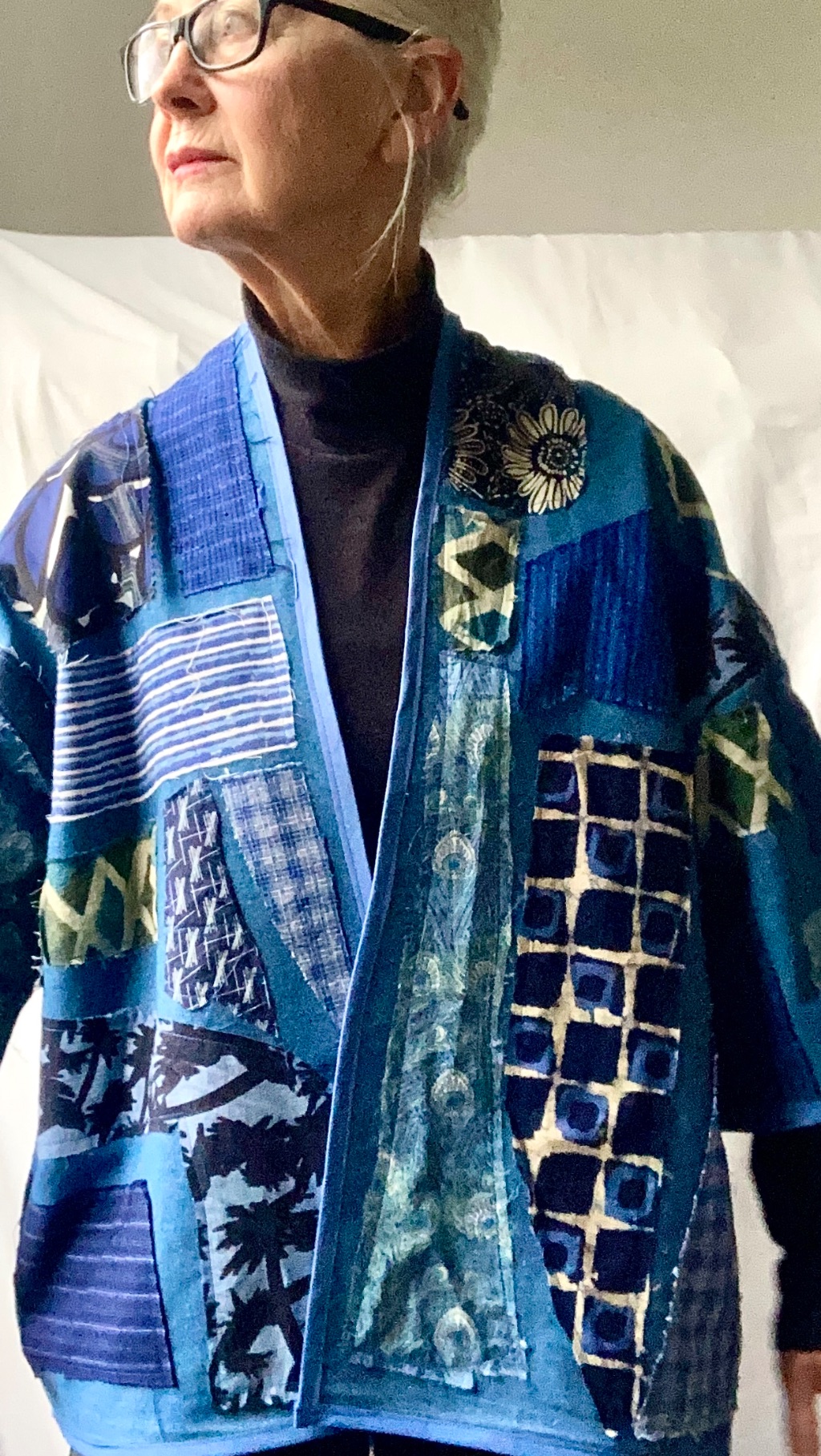 I create one-off kimonos, shirts,and accessories using fabric collected over 40+ years while travelling the world as a textile designer and lecturer. Each garment has its own story. They are made to wear, treasure, and keep.