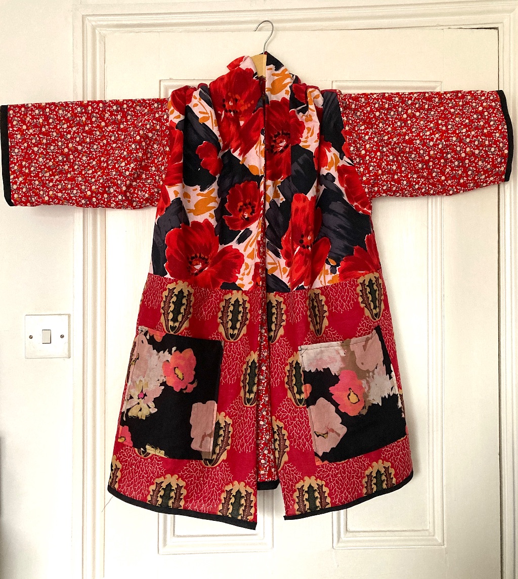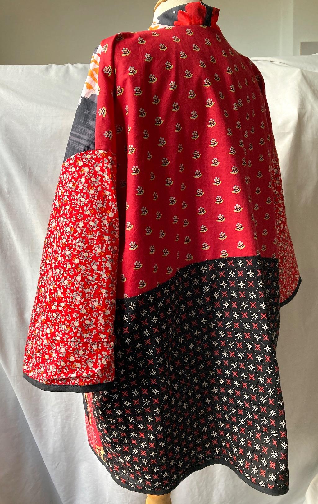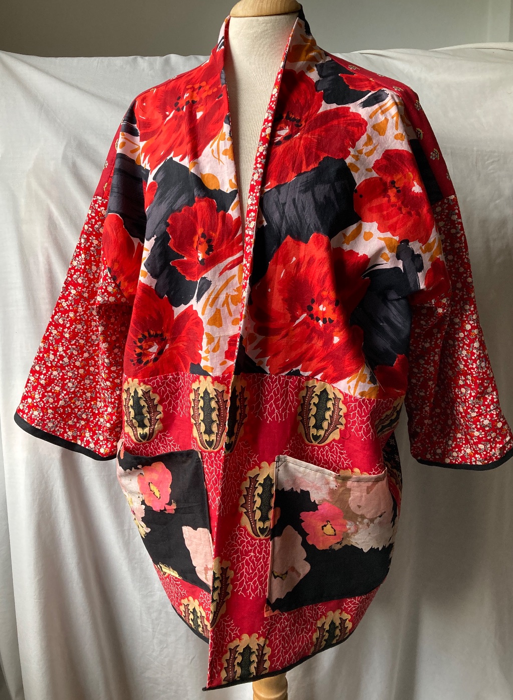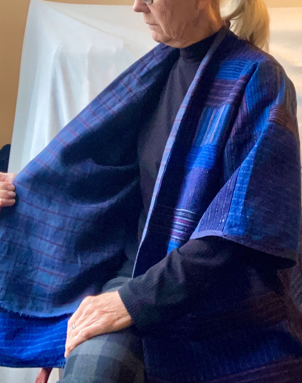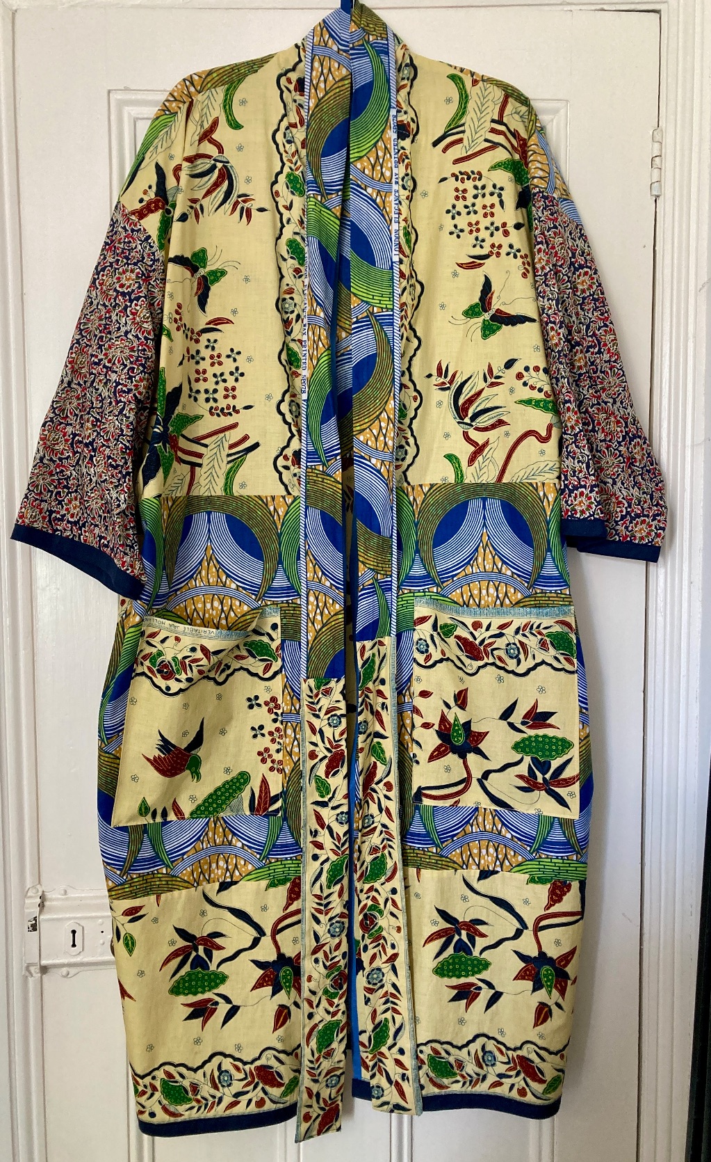 I create one-off kimonos, shirts,and accessories using fabric collected over 40+ years while travelling the world as a textile designer and lecturer. Each garment has its own story. They are made to wear, treasure, and keep.