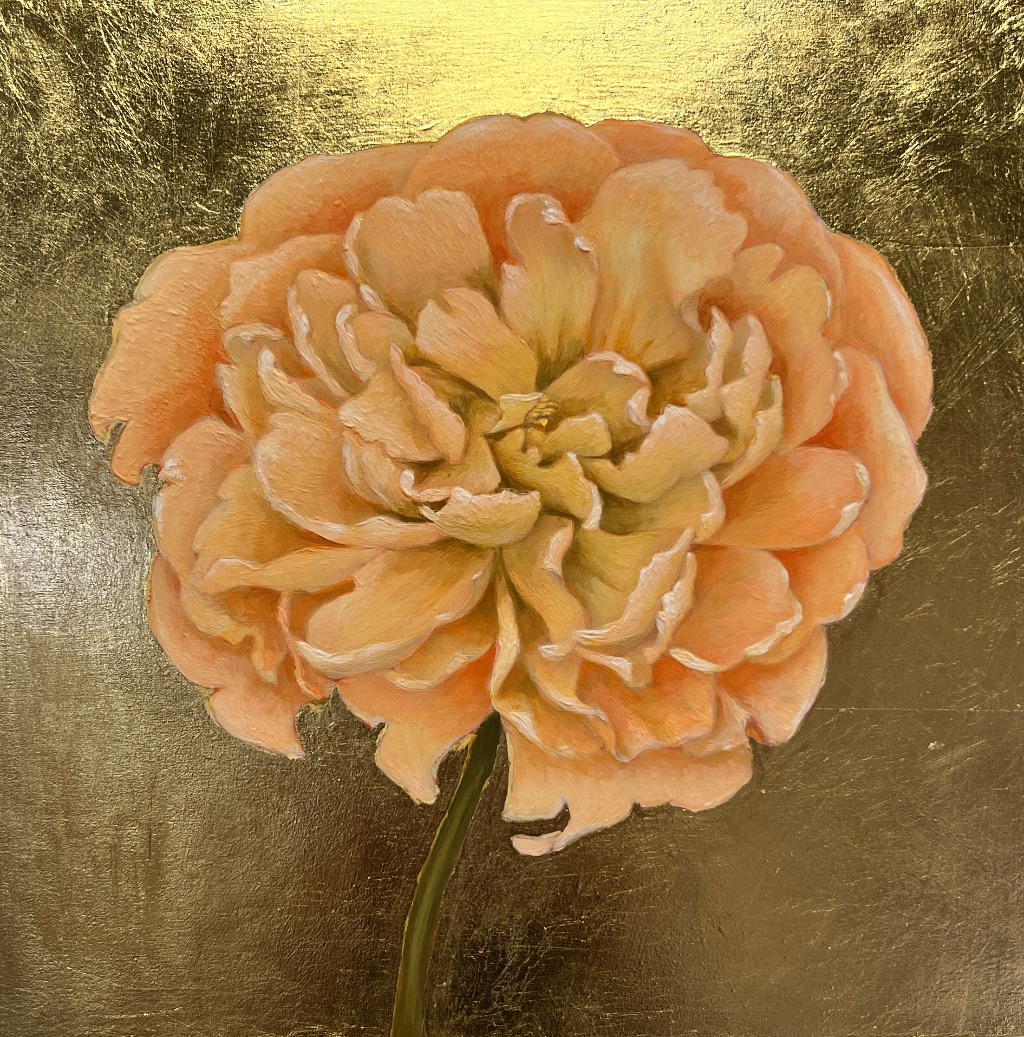 Drawing upon various mediums; including gold leaf, acrylic and screen-printing. I explore the interplay between light, texture, and colour. Gold, in my works, symbolises the air and space that envelop the flowers.