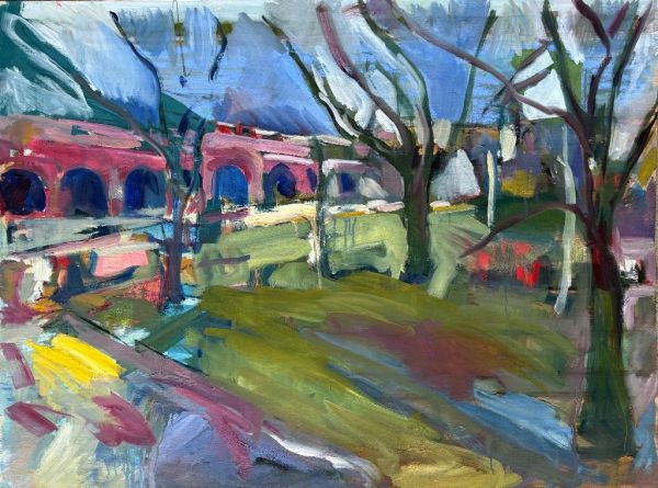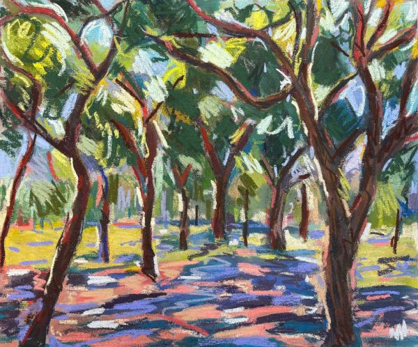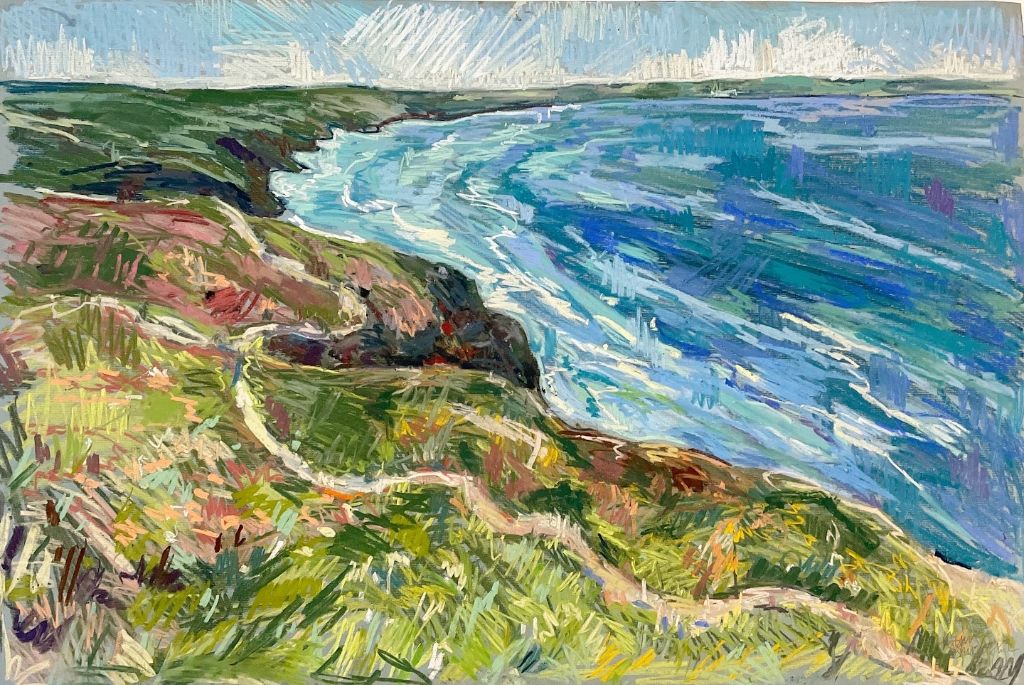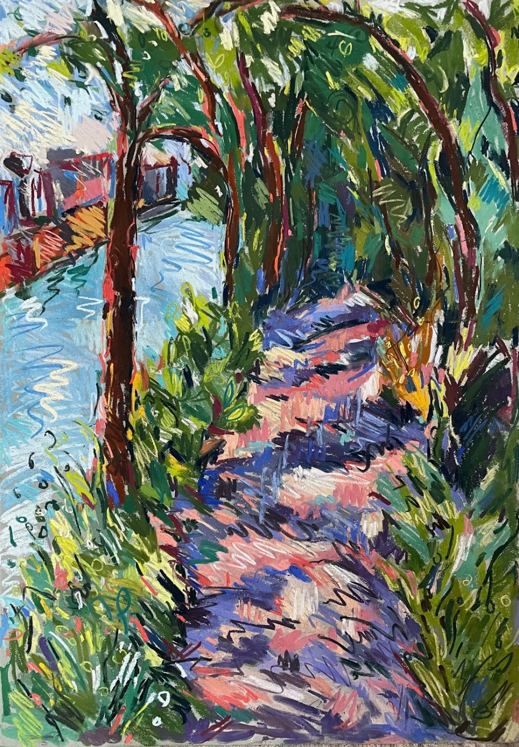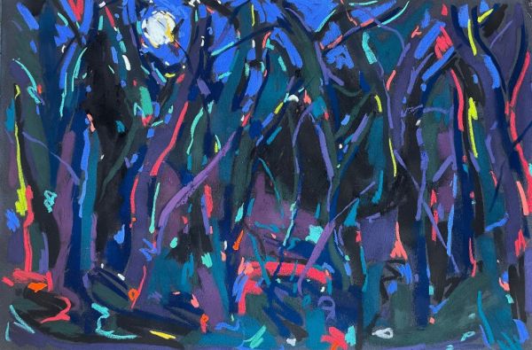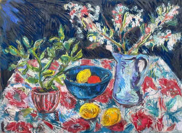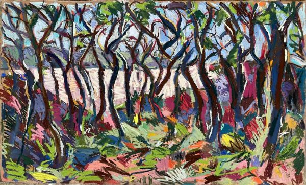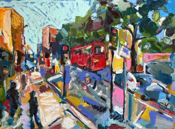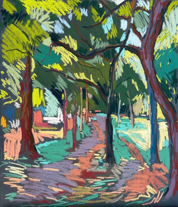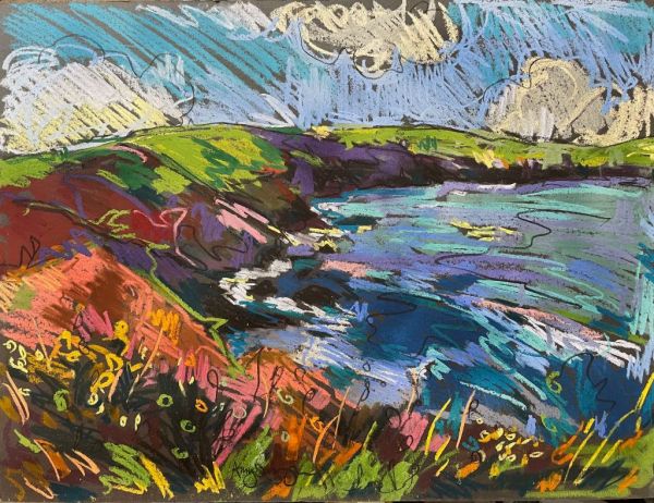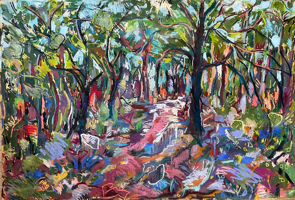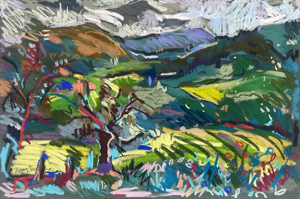 Amy Shuckburgh paints landscapes, still life, and figurative work, using soft pastel, oil paint and collage. Her landscapes are preoccupied with how colour affects mood. She simplifies shapes and uses dynamic brushstrokes and vivid tones to convey the emotion felt in a place.