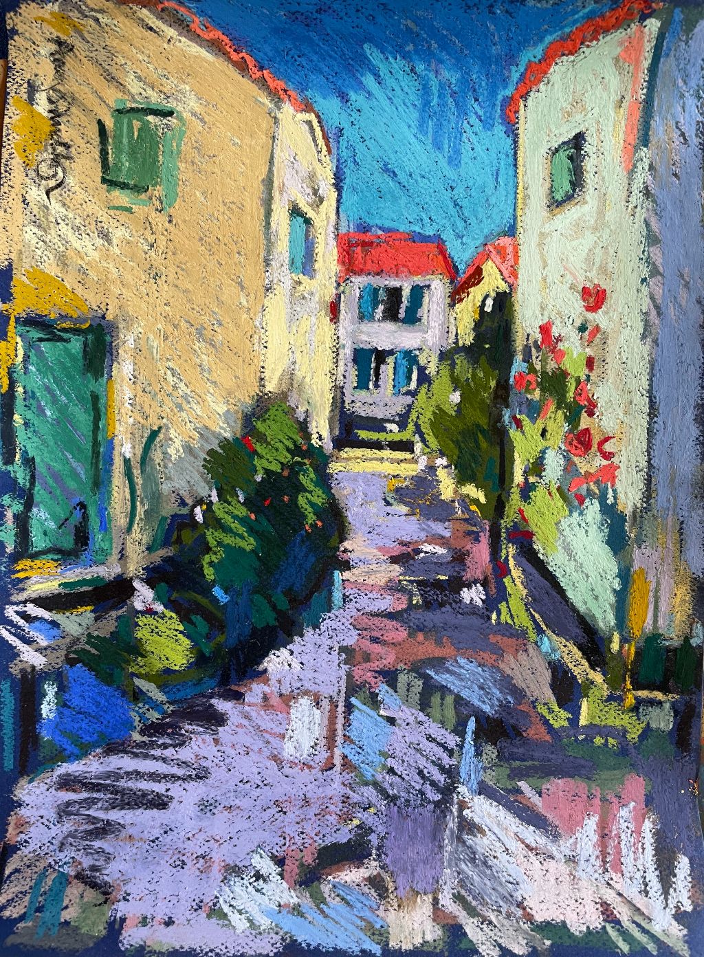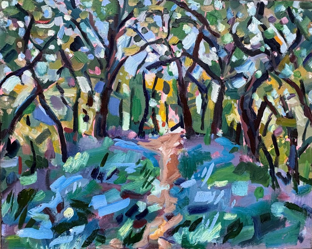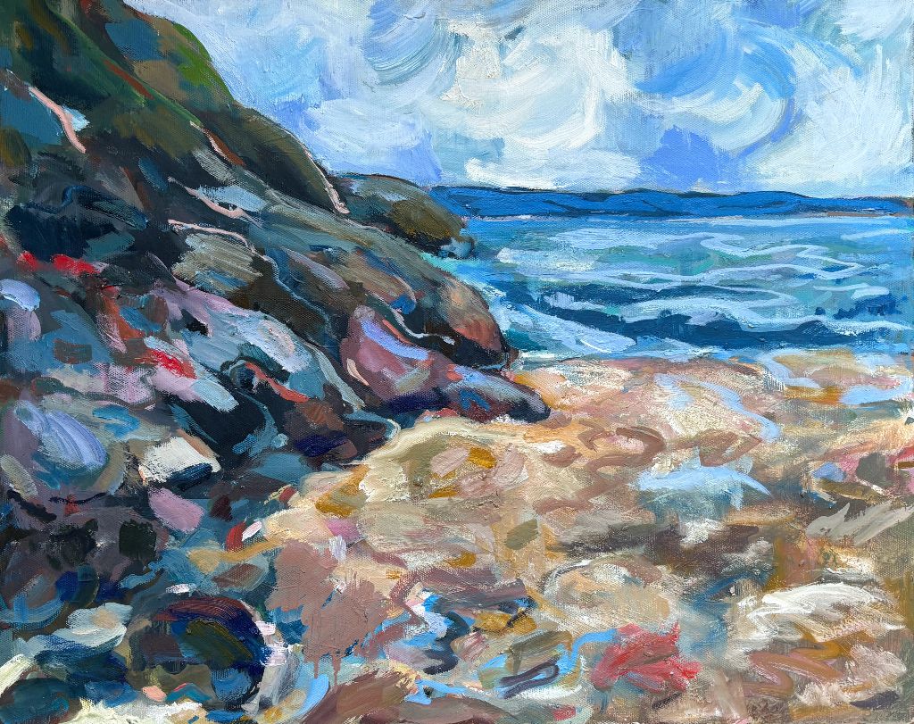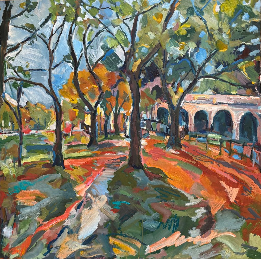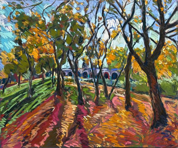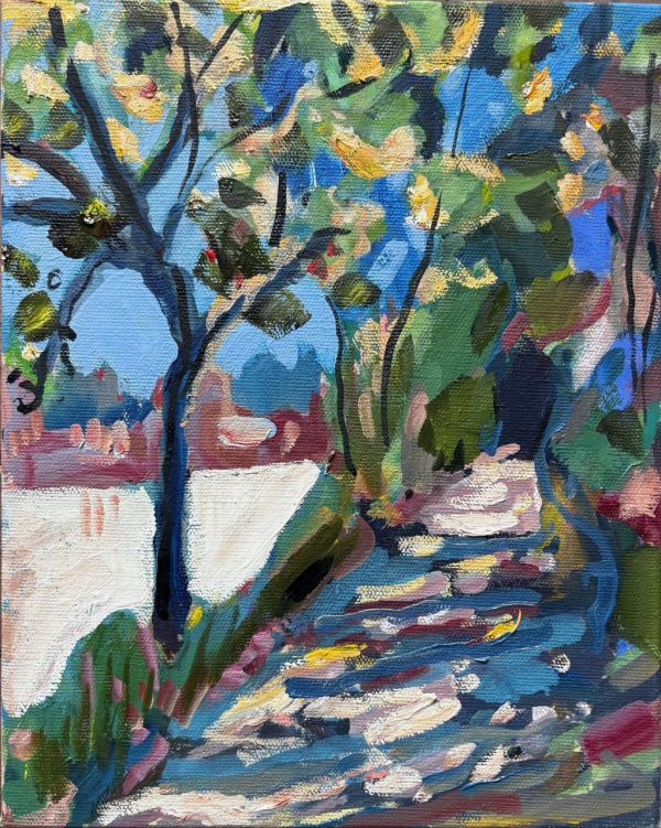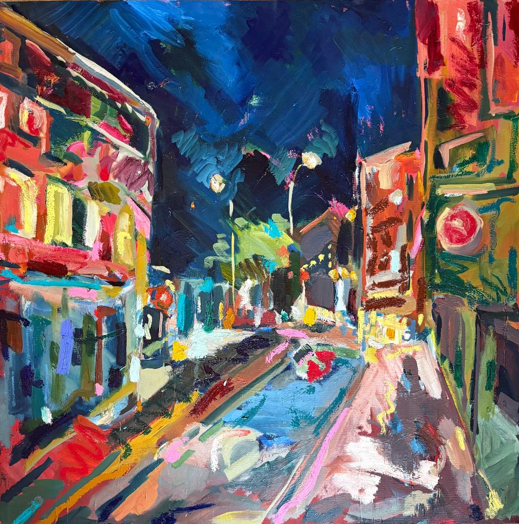 Amy Shuckburgh paints landscapes, still life, and figurative work, using soft pastel, oil paint and collage. Her landscapes are preoccupied with how colour affects mood. She simplifies shapes and uses dynamic brushstrokes and vivid tones to convey the emotion felt in a place.
