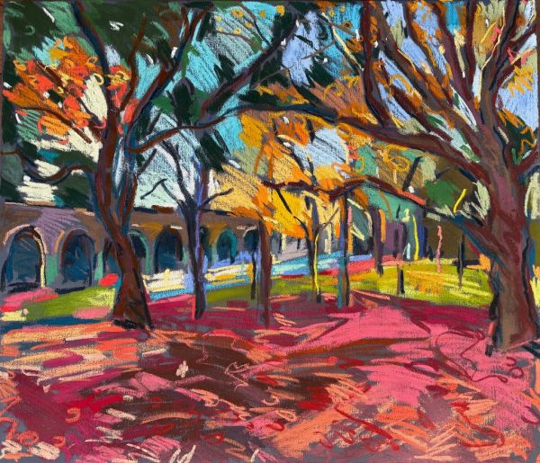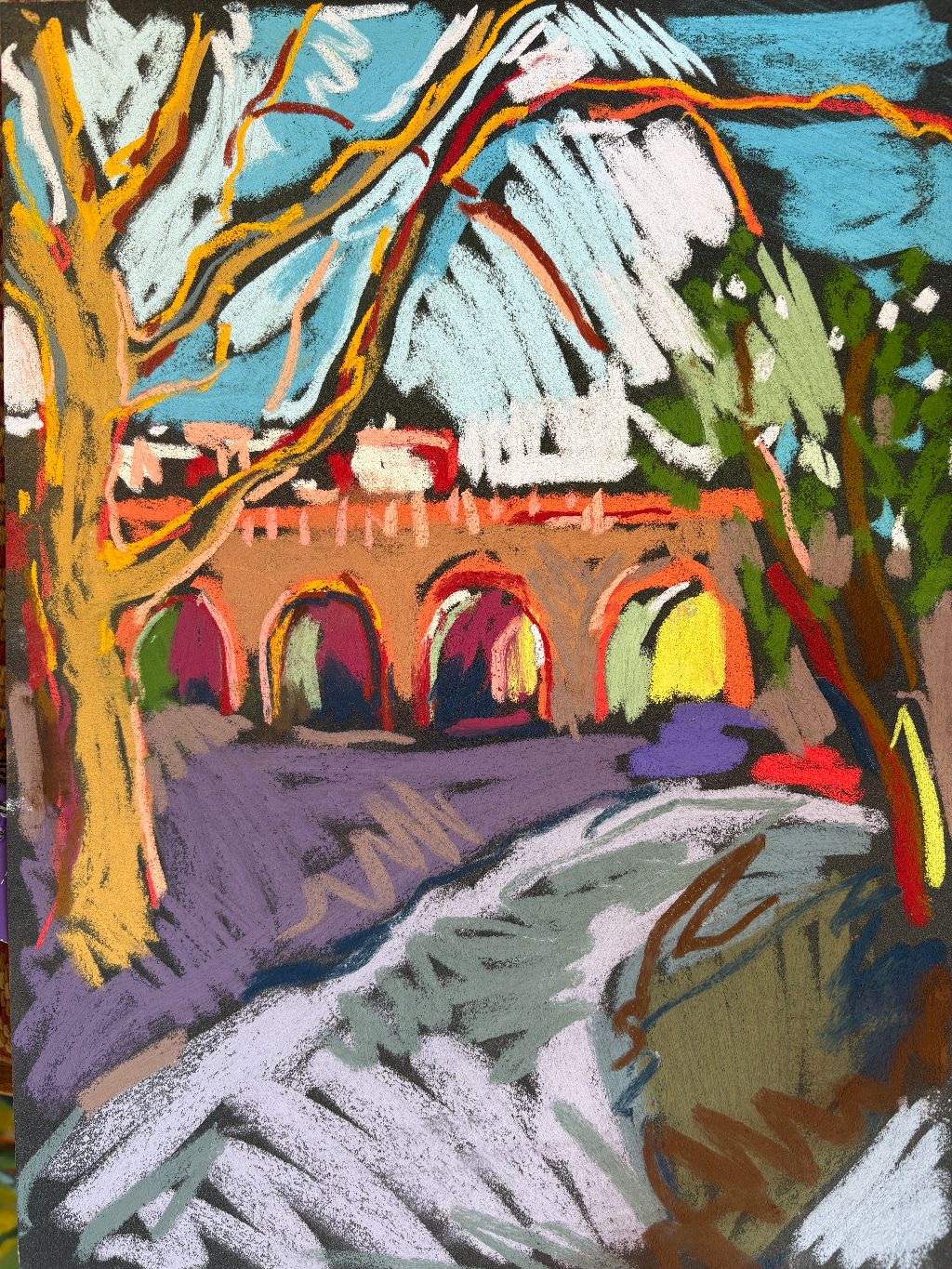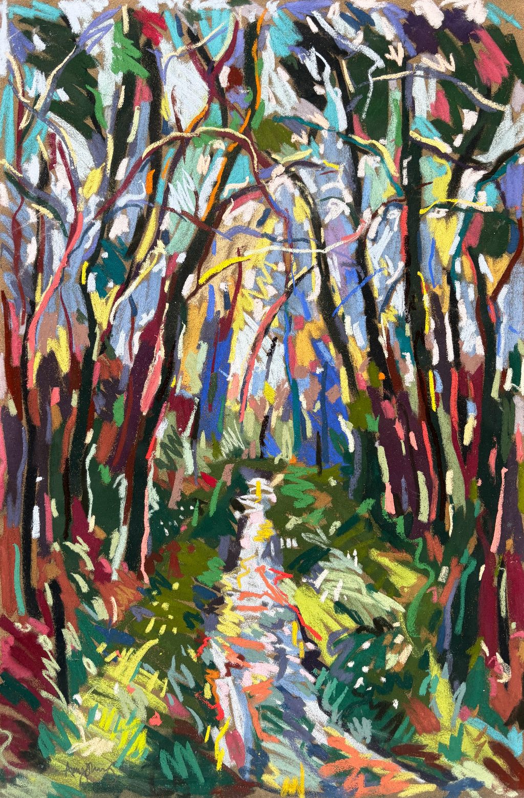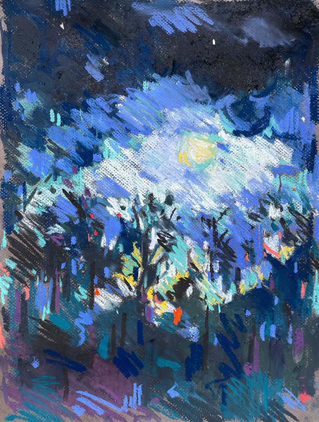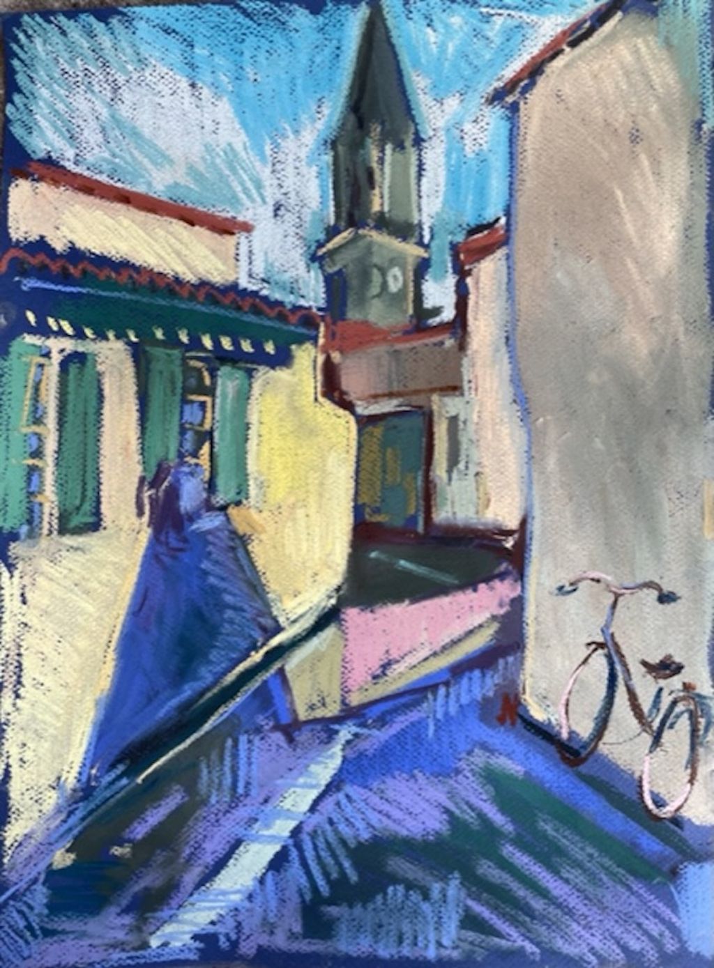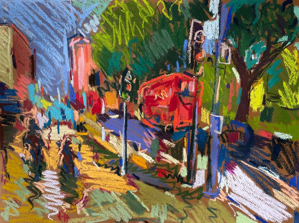 Amy Shuckburgh paints landscapes, still life, and figurative work, using soft pastel, oil paint and collage. Her landscapes are preoccupied with how colour affects mood. She simplifies shapes and uses dynamic brushstrokes and vivid tones to convey the emotion felt in a place.